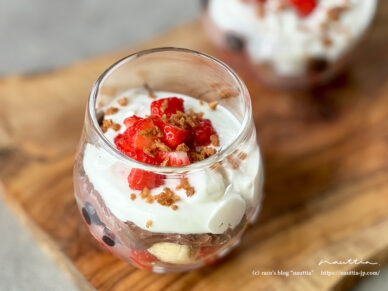 ギリシャヨーグルトパフェ(いちごココア)レシピ【簡単おやつ】